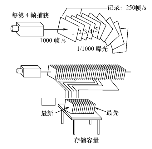 使用DRAM存儲器的高速攝像系統(tǒng)的另一種技術(shù)是外同步技術(shù)。這種記錄方式由用戶提供的信號來決定攝像系統(tǒng)的幀頻。圖5.5所示的應(yīng)用也可以用來解釋它的使用。在上述例子中,用戶可以輸入和測速計同步的頻率。當(dāng)頻率發(fā)生變化時,捕獲的圖像和測速計在正反方向上同步。這樣,蓋子的任何運動方向都被觀察到并被記錄。由于運動較快的目標(biāo)比運動較慢的目標(biāo)需要更高的攝像頻率,因此,記錄的速度同目標(biāo)的變化速度應(yīng)成正比。這些應(yīng)用包括:使用應(yīng)變儀進(jìn)行材料的變形實驗,使用壓力傳感器進(jìn)行內(nèi)燃機的火焰燃燒試驗,使用加速度計進(jìn)行汽車碰撞試驗,以及光敏傳感器來檢測爆炸的發(fā)生。這些都是基于DRAM存儲器的高速攝像系統(tǒng)的獨特工作方式。