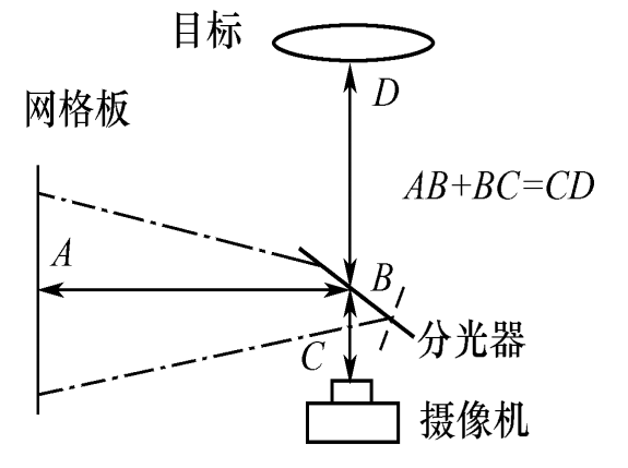 網(wǎng)格板的位置可以調(diào)整,保證目標(biāo)到鏡頭的距離同網(wǎng)格板到鏡頭的光程相等,保證網(wǎng)格板同目標(biāo)的運動平面垂直,分光器兩個平面的夾角為45°,這種布置需要較大的場所,并需花費很長的時間去布置。
