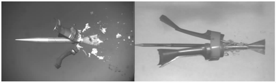 ? ? ? ?用于武器系統(tǒng)的發(fā)射、飛行、攻擊過程記錄和參數(shù)測(cè)試。圖為PhantomV5.0系統(tǒng)獲得的導(dǎo)彈發(fā)射序列圖像(攝像機(jī)視場(chǎng)固定),SVRⅡ攝像系統(tǒng)獲得彈丸脫殼圖像,攝像機(jī)放置在跟蹤架上跟蹤炮彈的飛行過程。