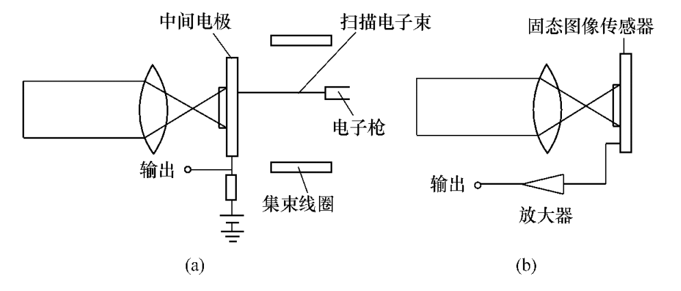 而圖(b)所示的固態(tài)圖像傳感器的輸出信號(hào)的產(chǎn)生,不需外加掃描電子束,它可以直接由自掃描半導(dǎo)體襯底上諸像素而獲得。輸出電信號(hào)與像素的位置對(duì)應(yīng),因而,再生圖像失真度極小。顯然,光導(dǎo)攝像管等圖像傳感器,由于掃描電子束偏轉(zhuǎn)畸變或聚焦變化等原因所引起的再生圖像的失真,往往是很難避免的。圖 攝像管與固態(tài)圖像傳感器原理比較(a)光導(dǎo)攝像管;(b)固態(tài)圖像傳感器。